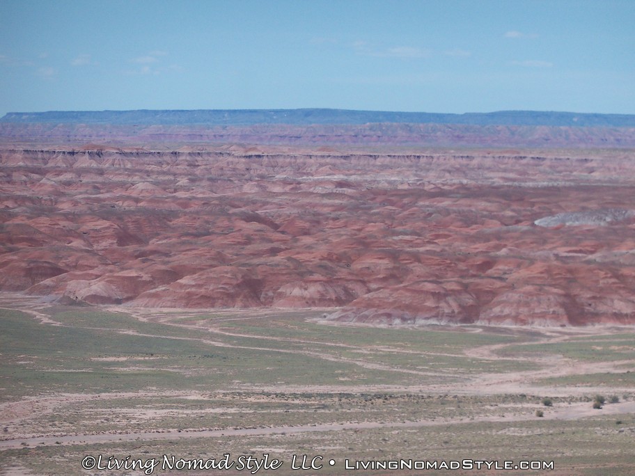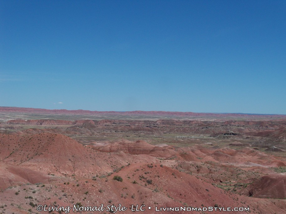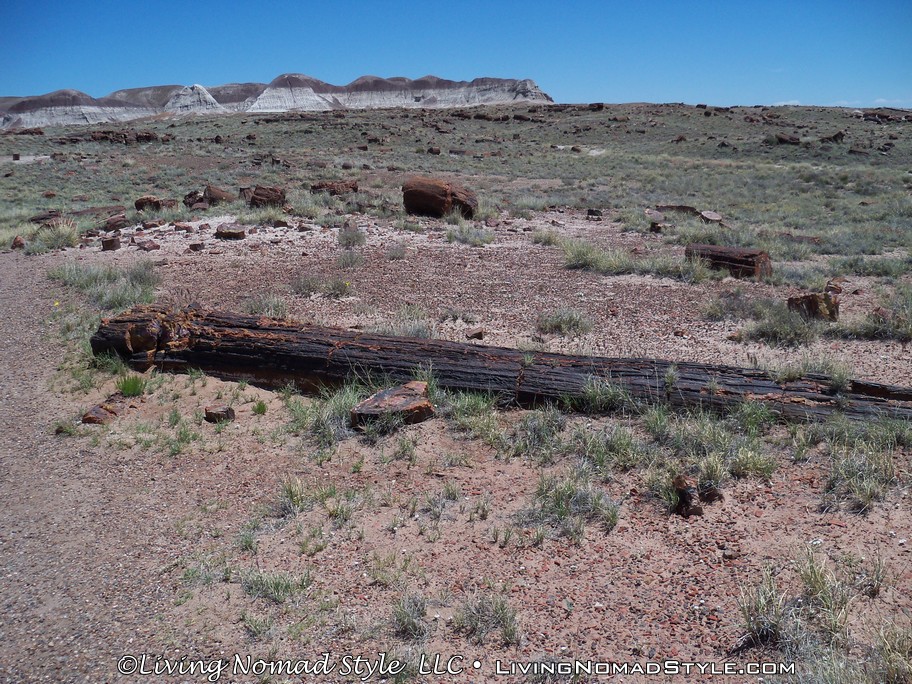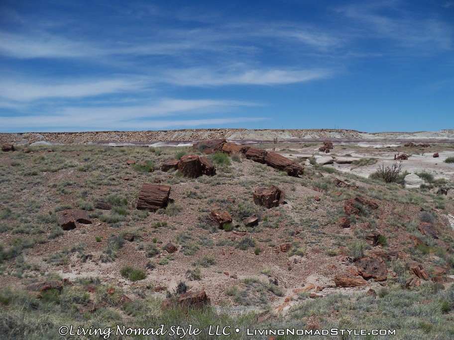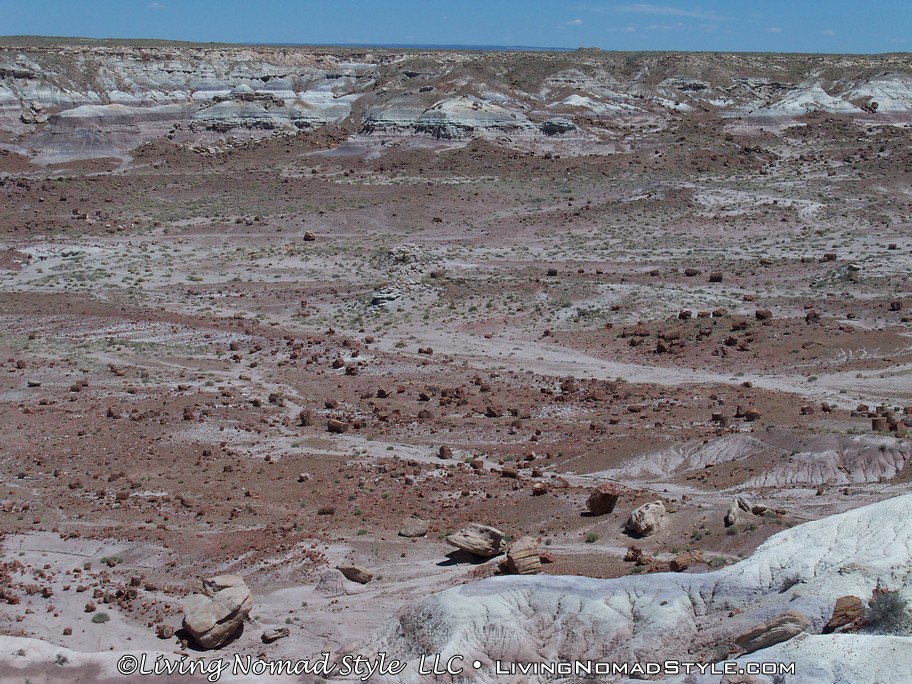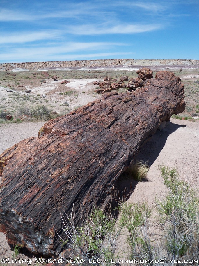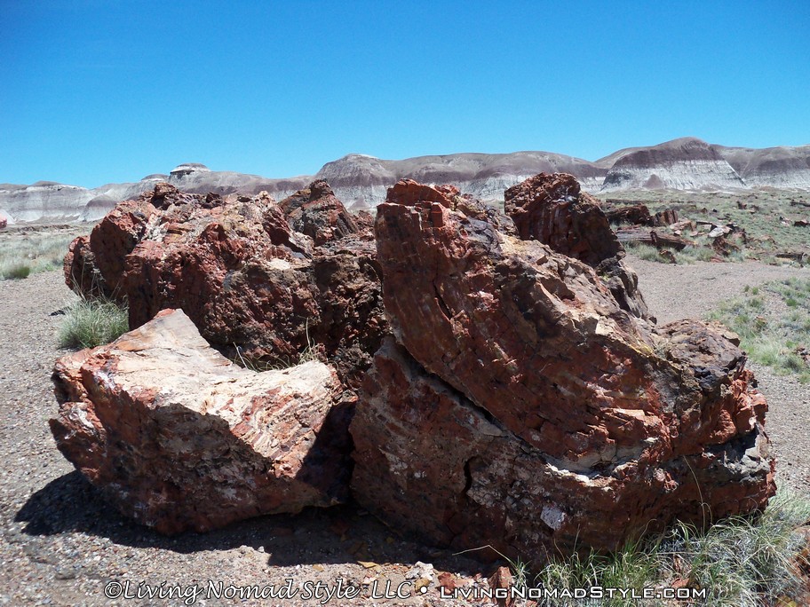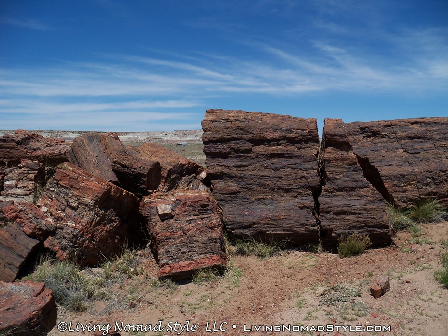 On our way from Utah to our new home base in New Mexico, we were passing by the Petrified Forest National Park and decided to dip in and check it out. If you enter from the Northern Entrance, off of Interstate 40, you will first come to the Painted Desert. That is because the Painted Desert is about 7,500 square miles and the Petrified Forest National Park is completely inside it. For those of you who have followed our travels, you will recall seeing pictures from the South Dakota, North Dakota and Montana Badlands. The Painted Desert reminds me of the same type of landscape but with different colors. It has more of a reddish tint to it. Looks pretty when you see it from an elevated vantage point.