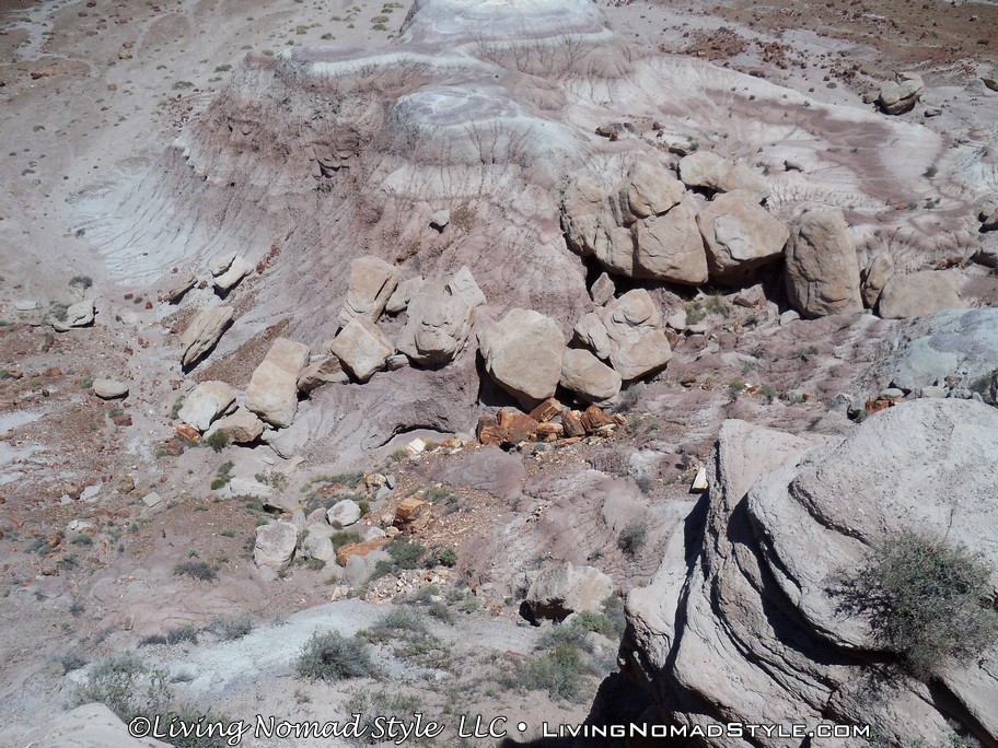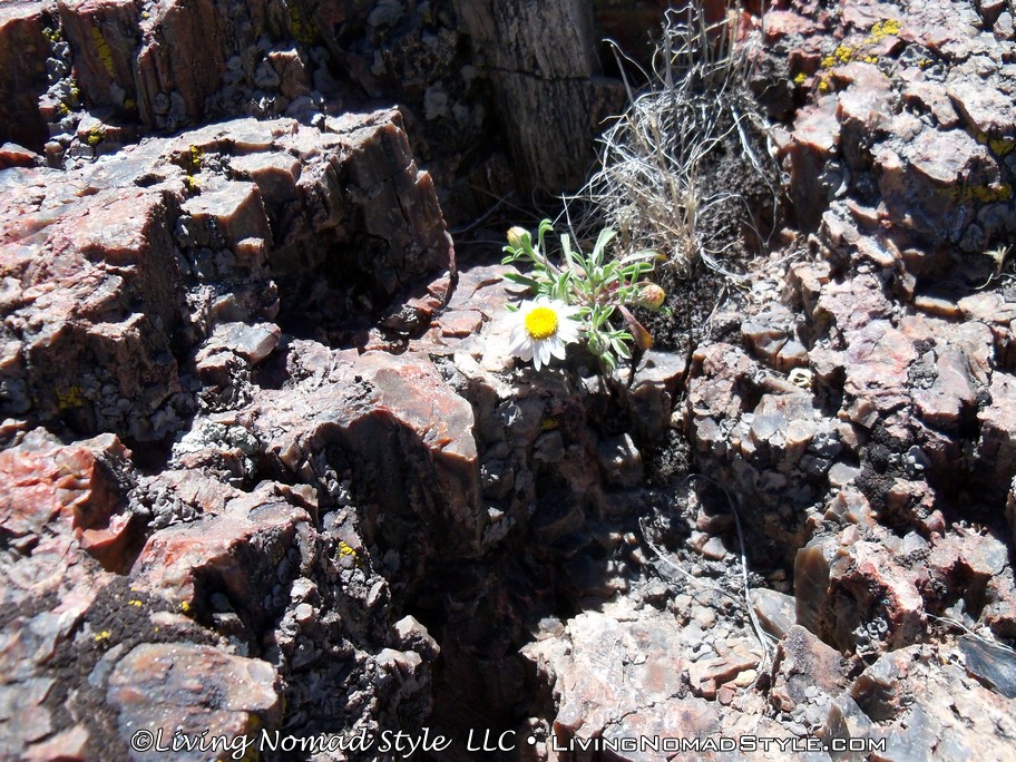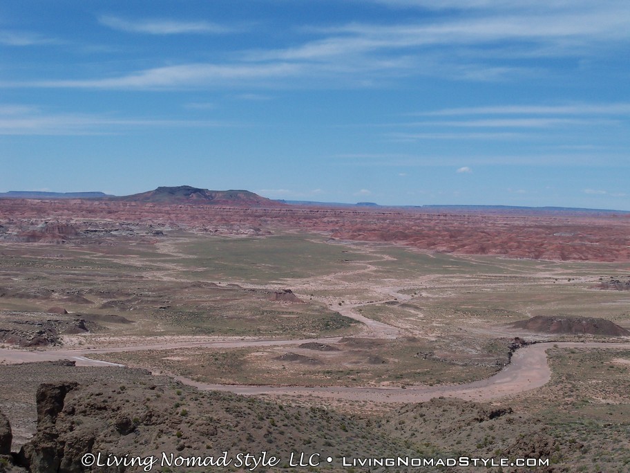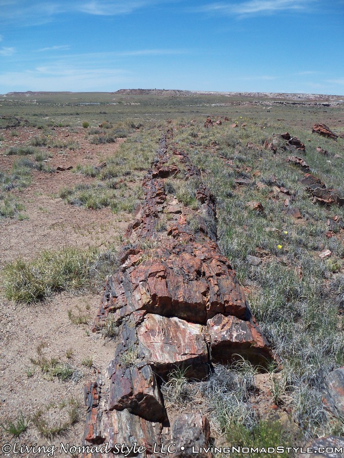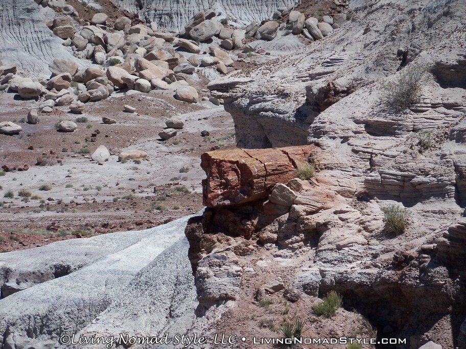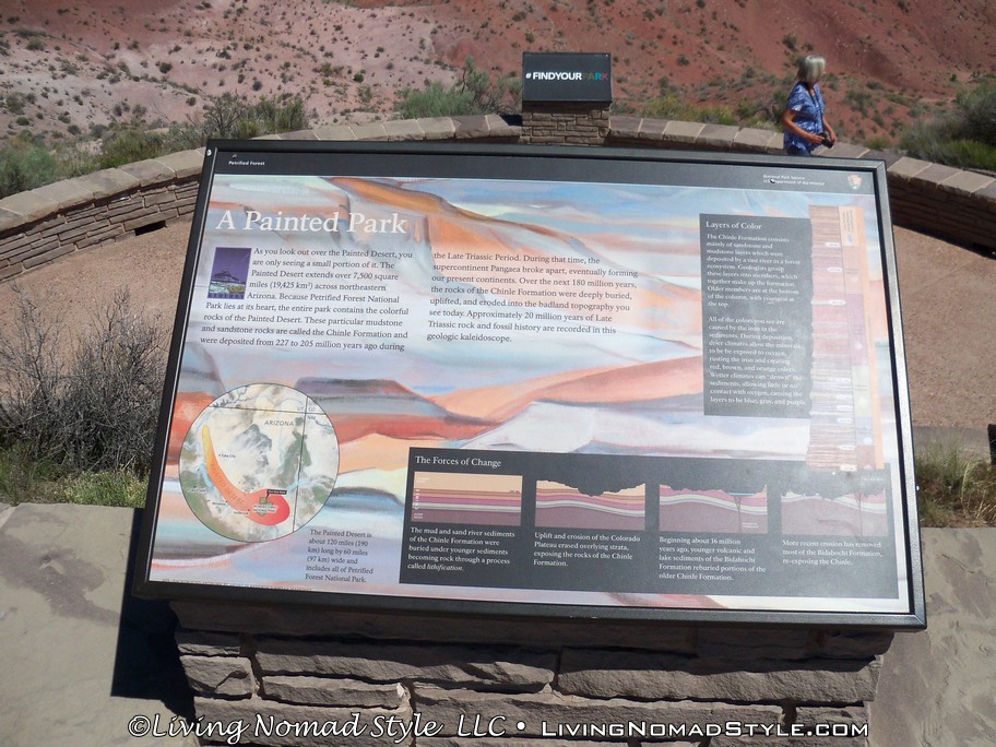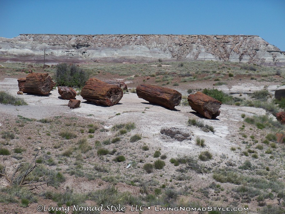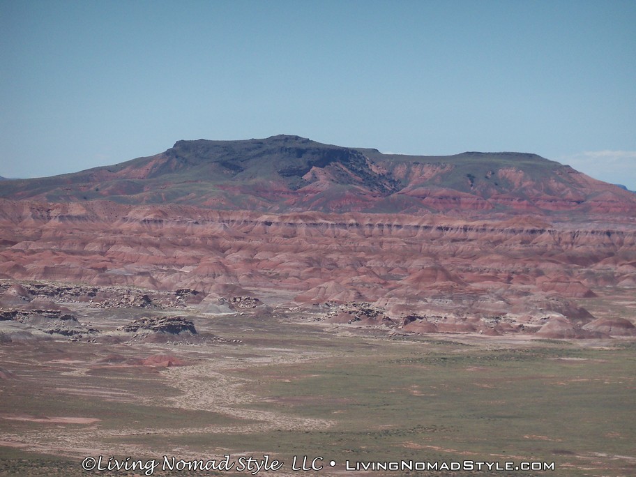 On our way from Utah to our new home base in New Mexico, we were passing by the Petrified Forest National Park and decided to dip in and check it out. If you enter from the Northern Entrance, off of Interstate 40, you will first come to the Painted Desert. That is because the Painted Desert is about 7,500 square miles and the Petrified Forest National Park is completely inside it. For those of you who have followed our travels, you will recall seeing pictures from the South Dakota, North Dakota and Montana Badlands. The Painted Desert reminds me of the same type of landscape but with different colors. It has more of a reddish tint to it. Looks pretty when you see it from an elevated vantage point.