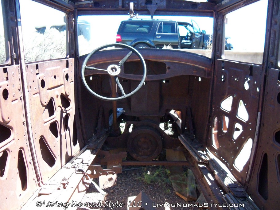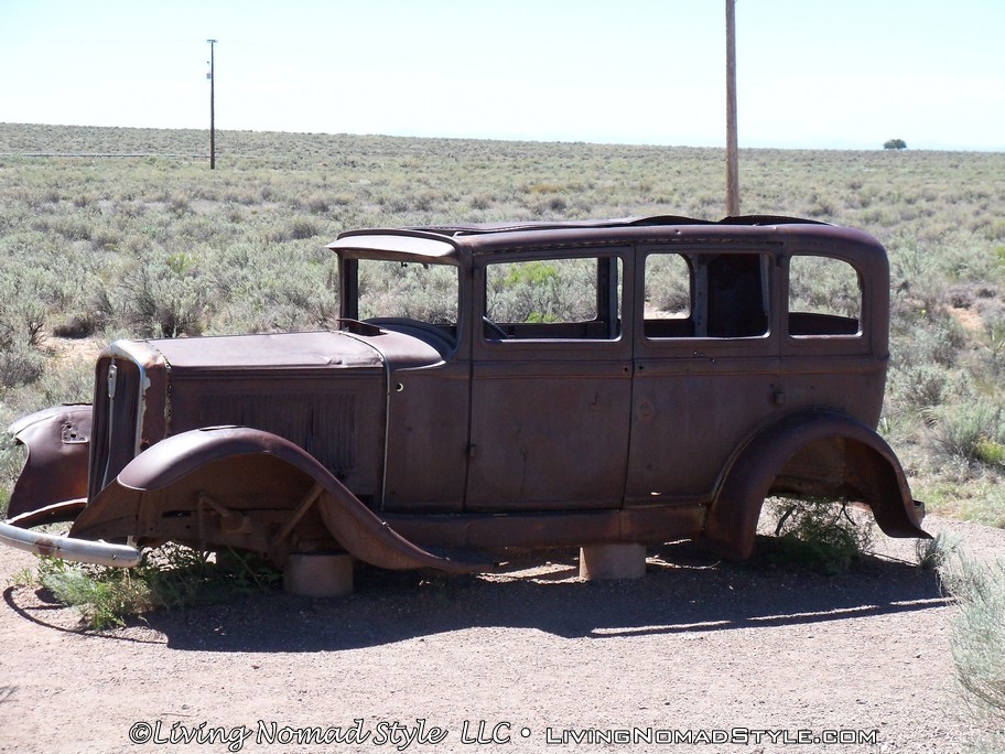 As you continue southward into the park, you will actually come to a very unique point. The Petrified Forest is the only National Park that had Historic Route 66 within its borders. From 1926 to 1958, Route 66 ran through the Petrified Forest National Park. This introduced millions of people to the Petrified Forest. Today there is the remains of a 1932 Studebaker to mark where Route 66 was. And you can see lines of telephone poles that ran parallel to the old route.