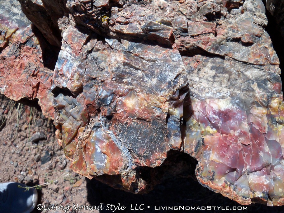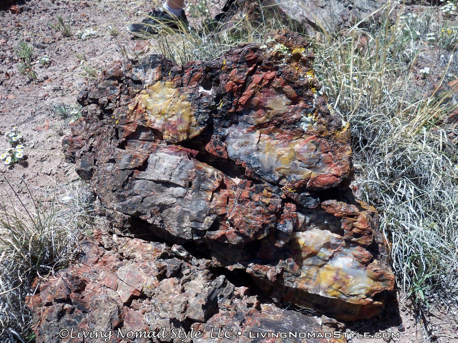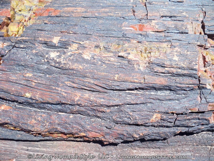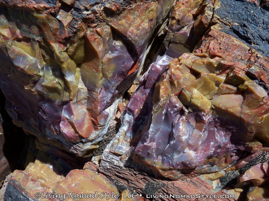 We left the Jasper Forest and made our way to the information center area that had a museum, gift shop and parking; the customary buildings you see by an entrance to a National Park. We had finally arrived at the Southern Entrance. From here, there are a few different hikes you can take. So we hiked and headed out to Long Logs, just north of the parking area. This is an area where it looked like trees had fallen, floated down a river and got stuck along the way into various log jams. The path takes you out among some of them. There are full-sized and very long logs all over the place. This is the first time we could really get up close and personal to examine the multiple and vibrant colors that made up the petrified logs.