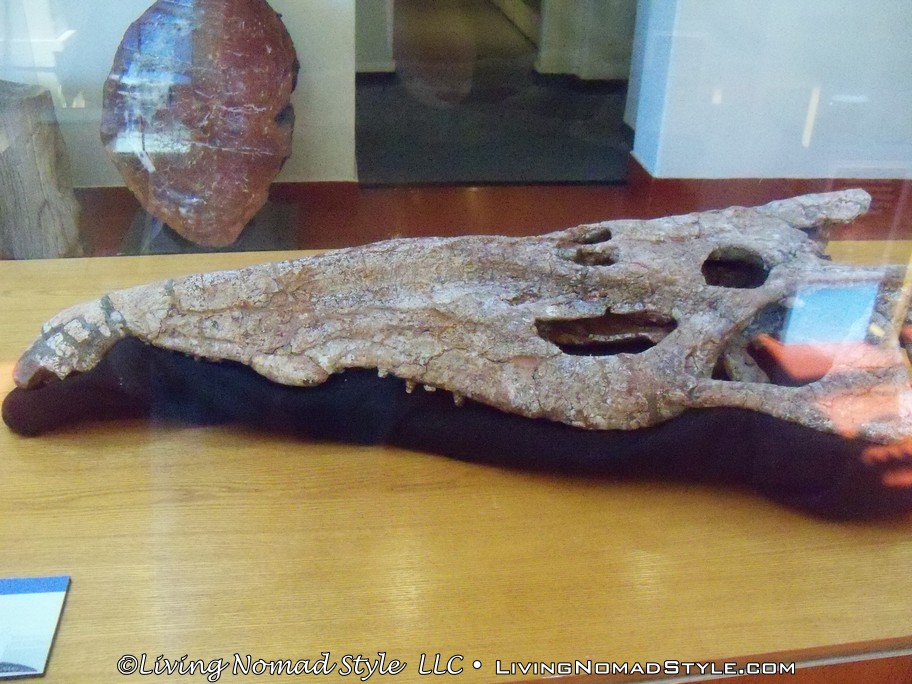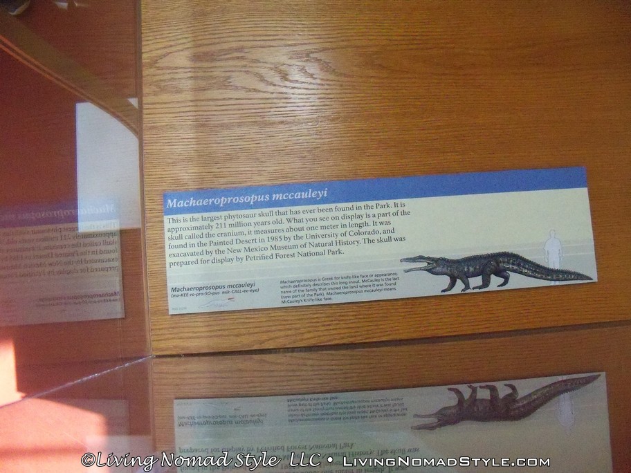 Once finished with Long Logs, we hiked back to the parking area and stopped off in the information center for a bathroom break.  While in there, we saw some displays and learned that this area also supported a population of phytosaurs. These are crocodile like creatures whose heads could grow up to 3 feet or so in length, with a total body length of 17 feet and weigh up to 2100 pounds! We saw a fossil of a cranium that is over 21 million years old. They were a top aquatic predator in the area during their time period.