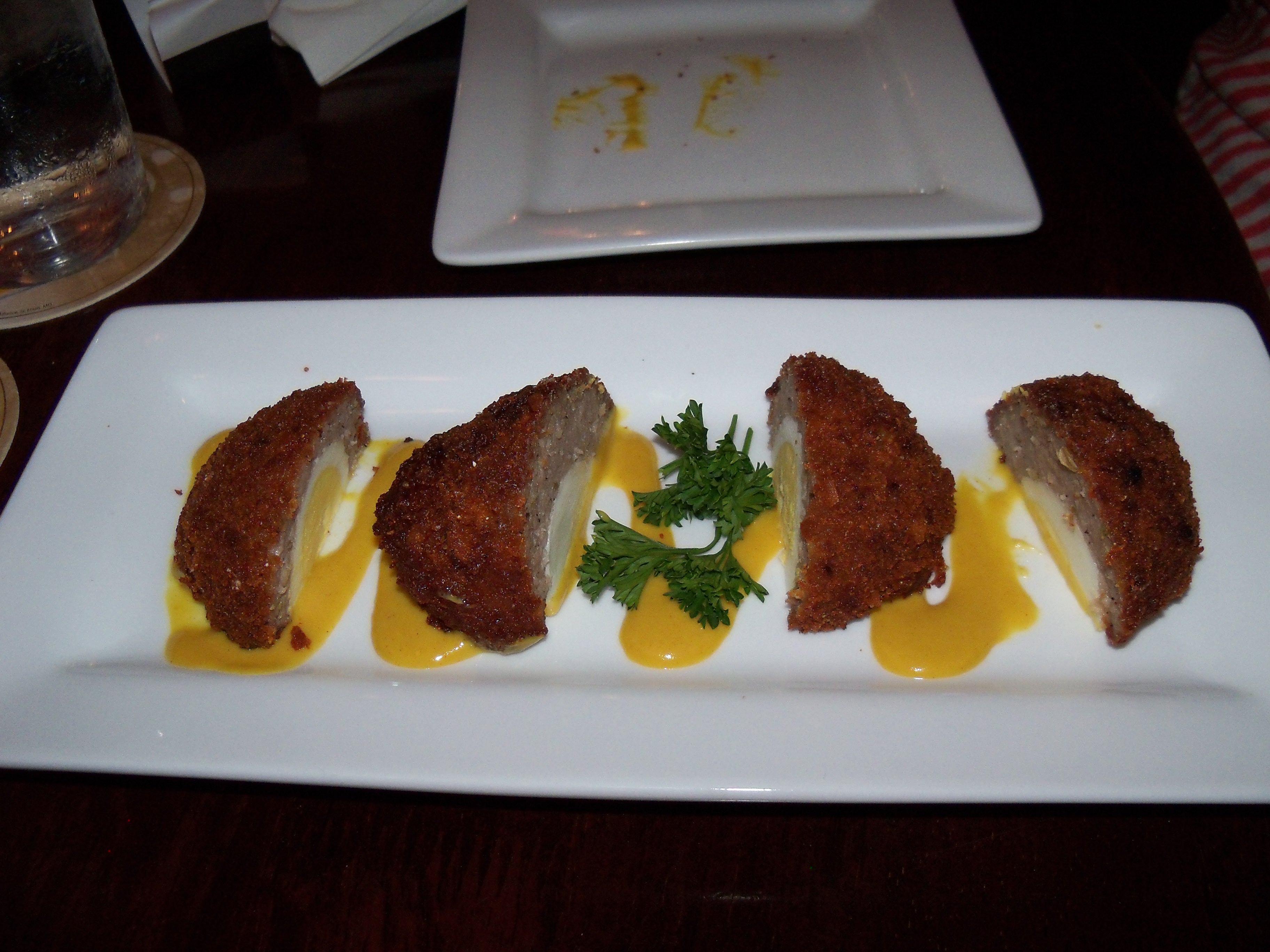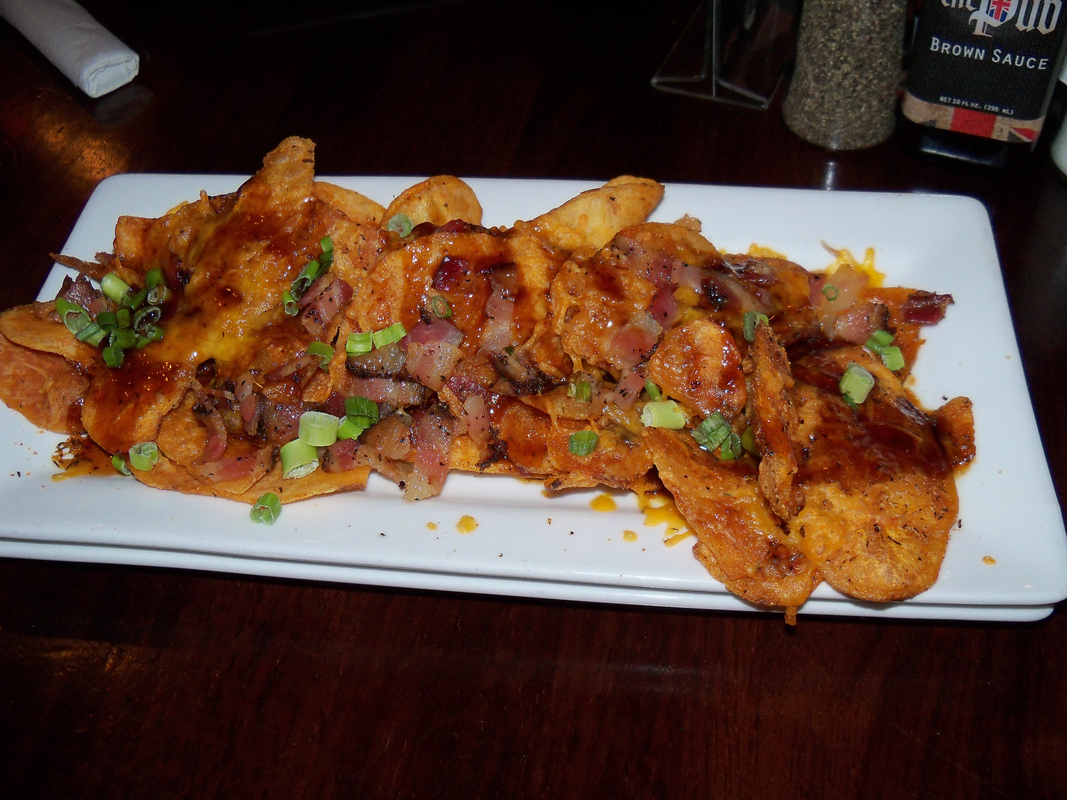 We were sat down and promptly met by our server, Kara. She was very courteous. It amazed me that she took our entire order without paper or pen. We ordered some Scottish Eggs and Young’s BBQ Crisps as appetizers. Scottish Eggs are hard-boiled egg wrapped in sausage & parmesan bread crumbs, fried, garnished with our Pub mustard. Young’s BBQ Crisps are house-made crisps loaded with cheddar, bacon, scallions & Young’s Double Chocolate Stout BBQ sauce. They were both delicious. The Scottish Eggs were the second best ones I have tried. I have a personal mission to find the best Scottish Eggs made. We, Mandy and I, enjoyed them with a frosty glass of Belhaven Scottish Ale.