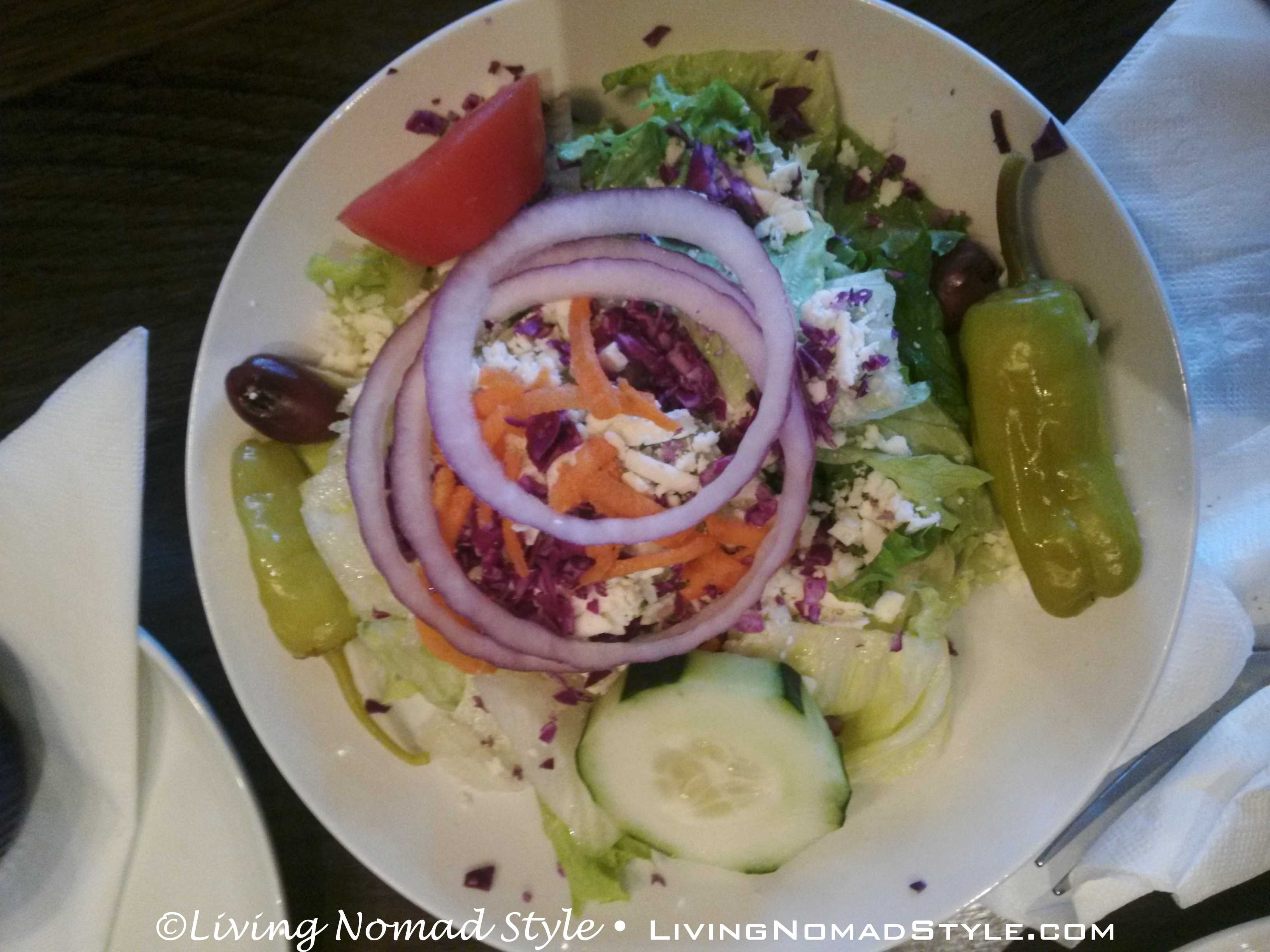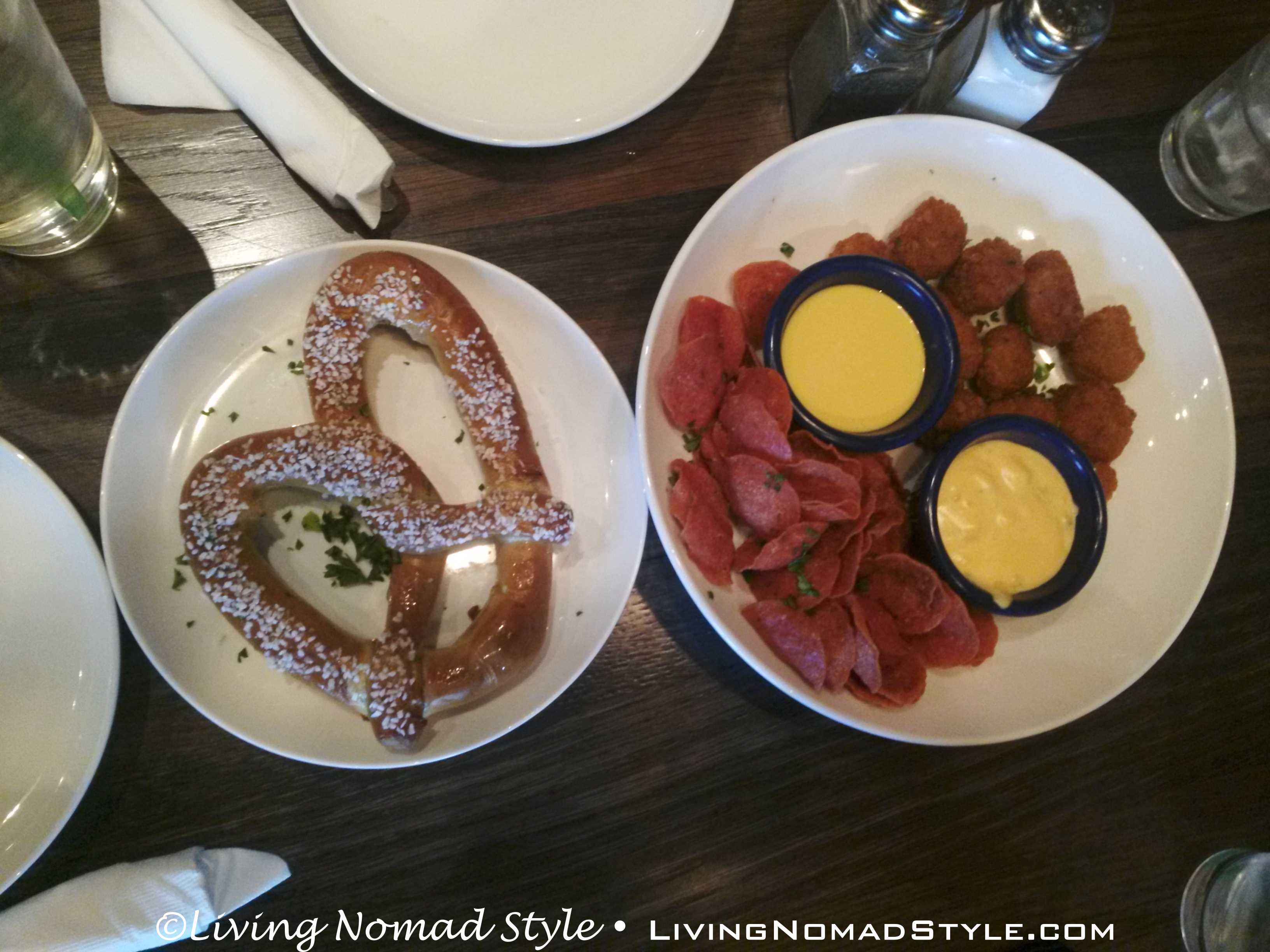 We wanted an appetizer as we were too hungry to wait for our entrées so we decided on the Twisted Trio: fried pepperoni, pilsner beer cheese bites and a baked super pretzel. We realized that we prefer regular pepperoni to the fried variety. The super pretzel was very salty. However, most are. We keep looking for that one that has a good balance on the saltiness. The cheese bites were scrumptious, especially in the honey mustard dipping sauce and the Greek Salads were delicious.