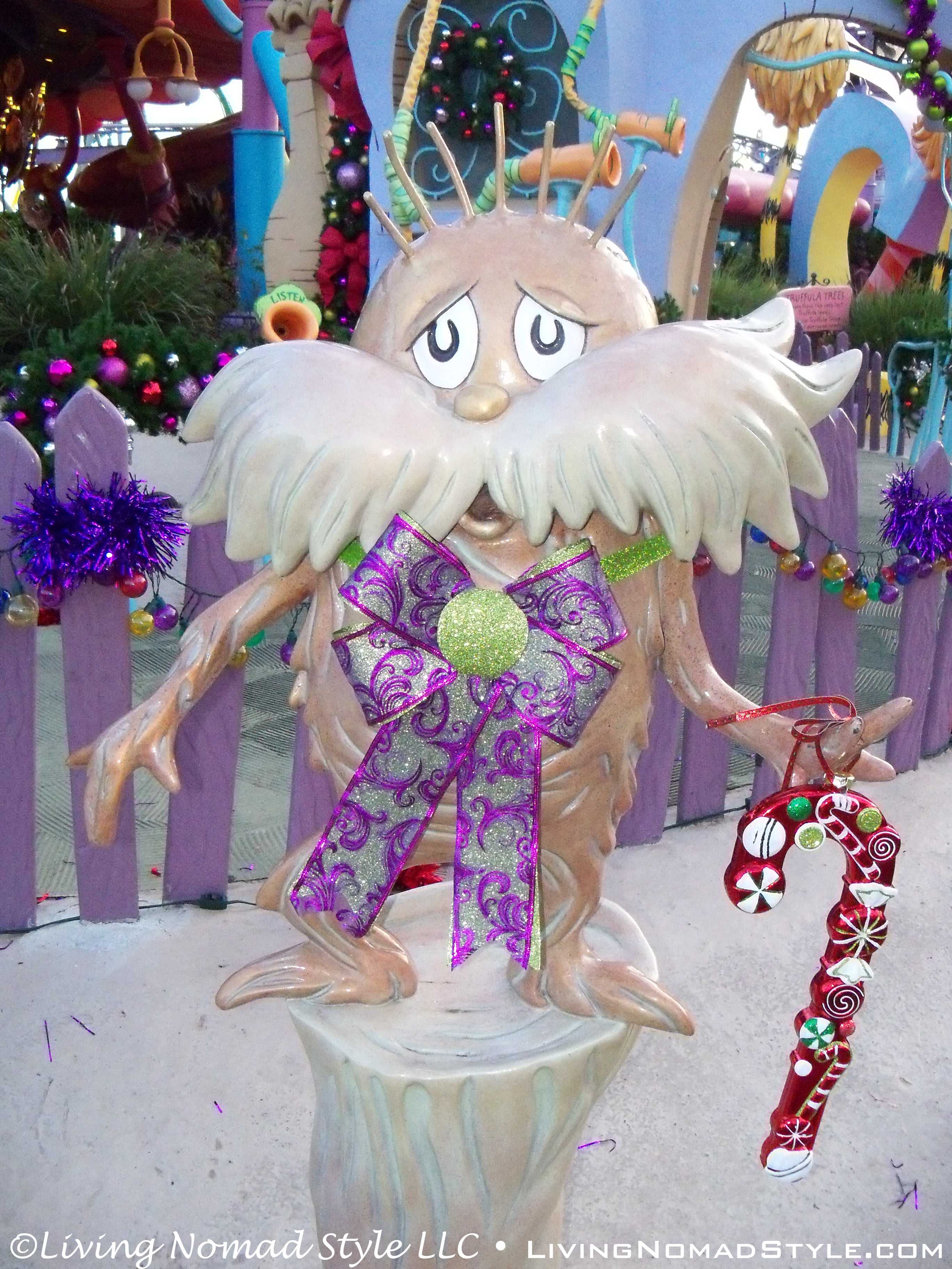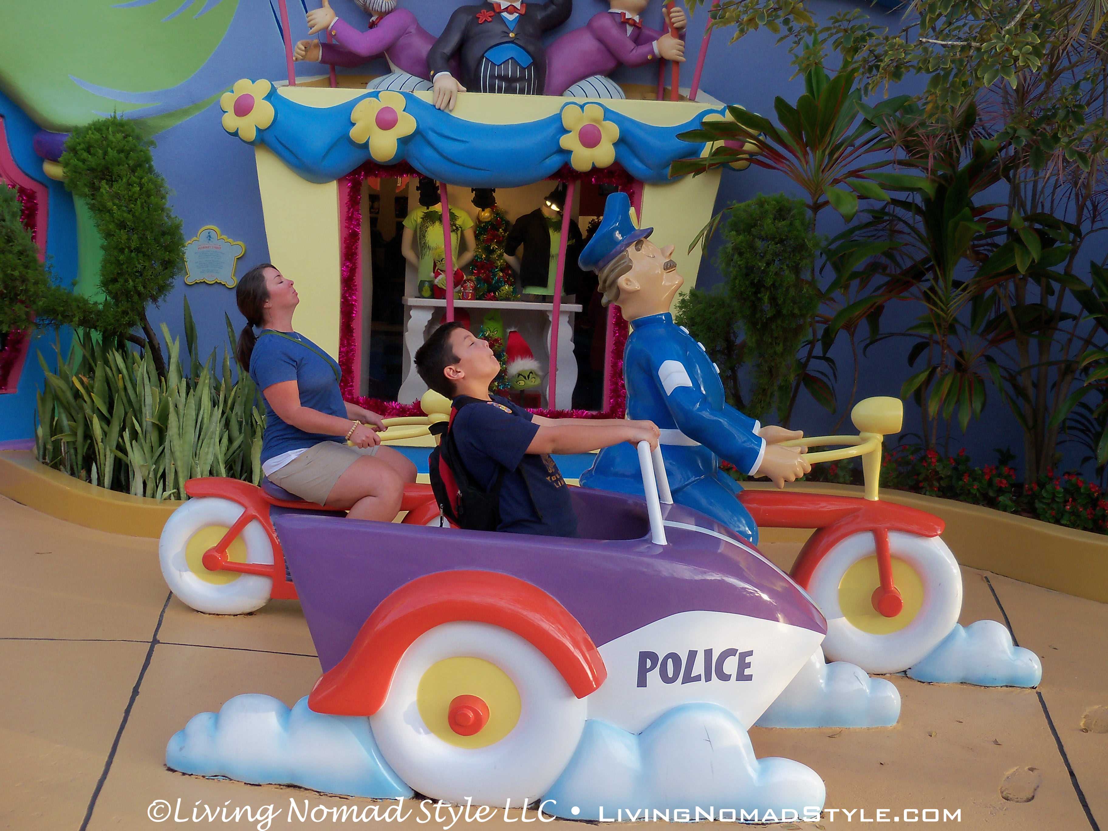 Leaving the Lost Continent you enter the topsy-turvy world of Dr. Seuss at Seuss Landing. This place looks like it is right out of the books. The detail that they went through was astounding. We had lots of fun just admiring all of the artistry of the area. Because we are approaching the Christmas Season, they had wreaths, garland, ribbons, bows, lights and trees with ornaments everywhere. I kept feeling like I should stop and sing “Fah who for-aze, Dah who dor-aze” while The Grinch steals Christmas.