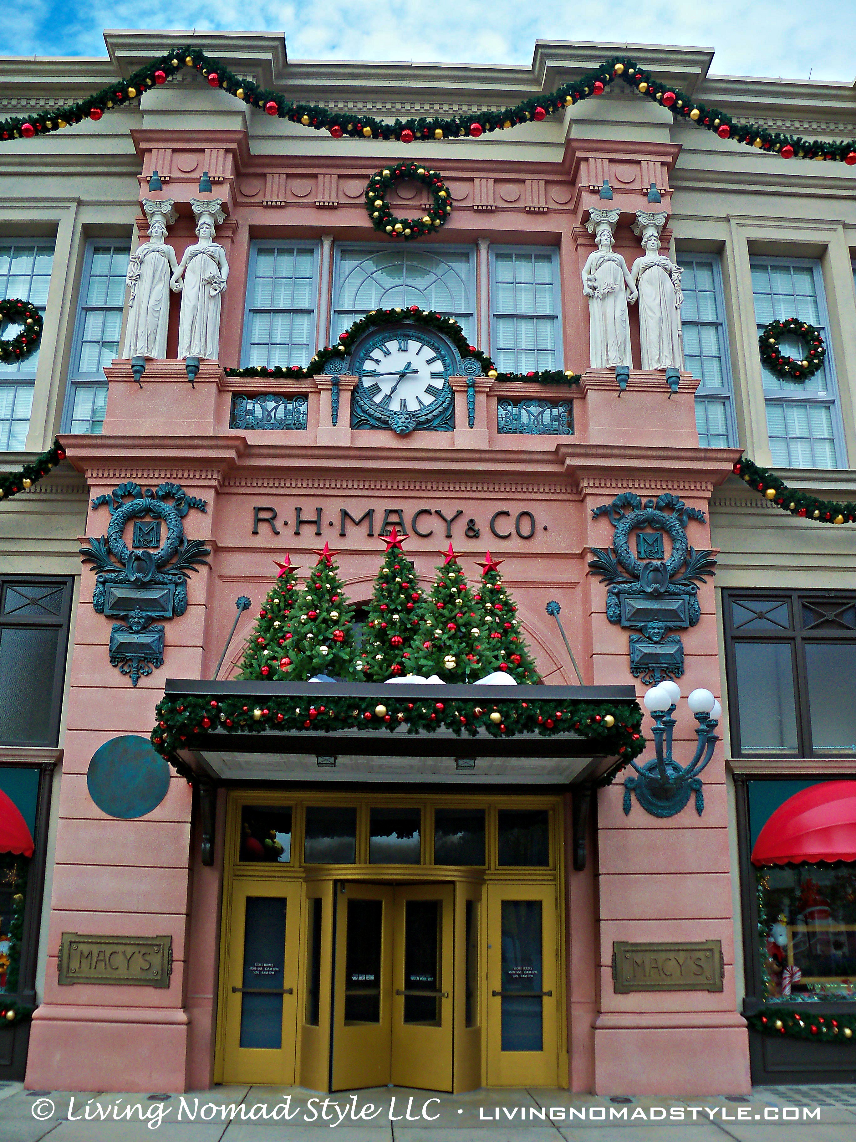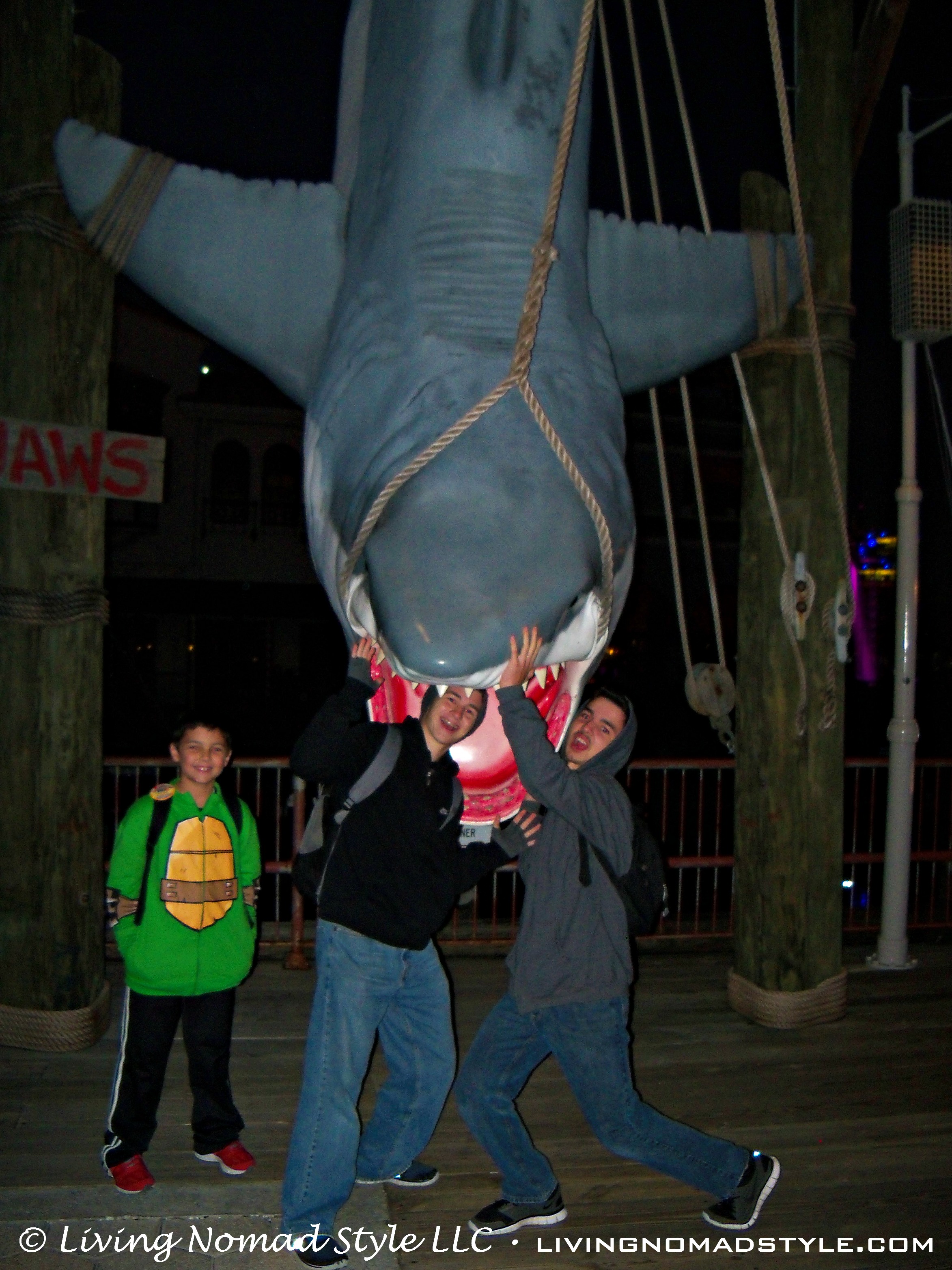 On our way to the next attraction, we meandered through the streets of an old world recreation of a 1920s looking cityscape. It had Christmas trees, wreaths and more. We exited by the port that was supposed to be the recreation of Jaws. That is one big shark!