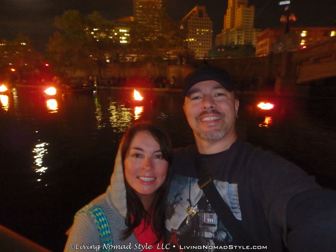 After the bonfires were lit in the basin, the boats continued down the river. We vacated the upper patio area and headed down to the river side to walk along the water and admire all of the bonfires. We eventually got back to the populated area where the vendors were between Washington and College Streets on Canal Street. We continued to walk south of College Street into Market Square. This is an area where you will find a WWII and Korean War Memorial.