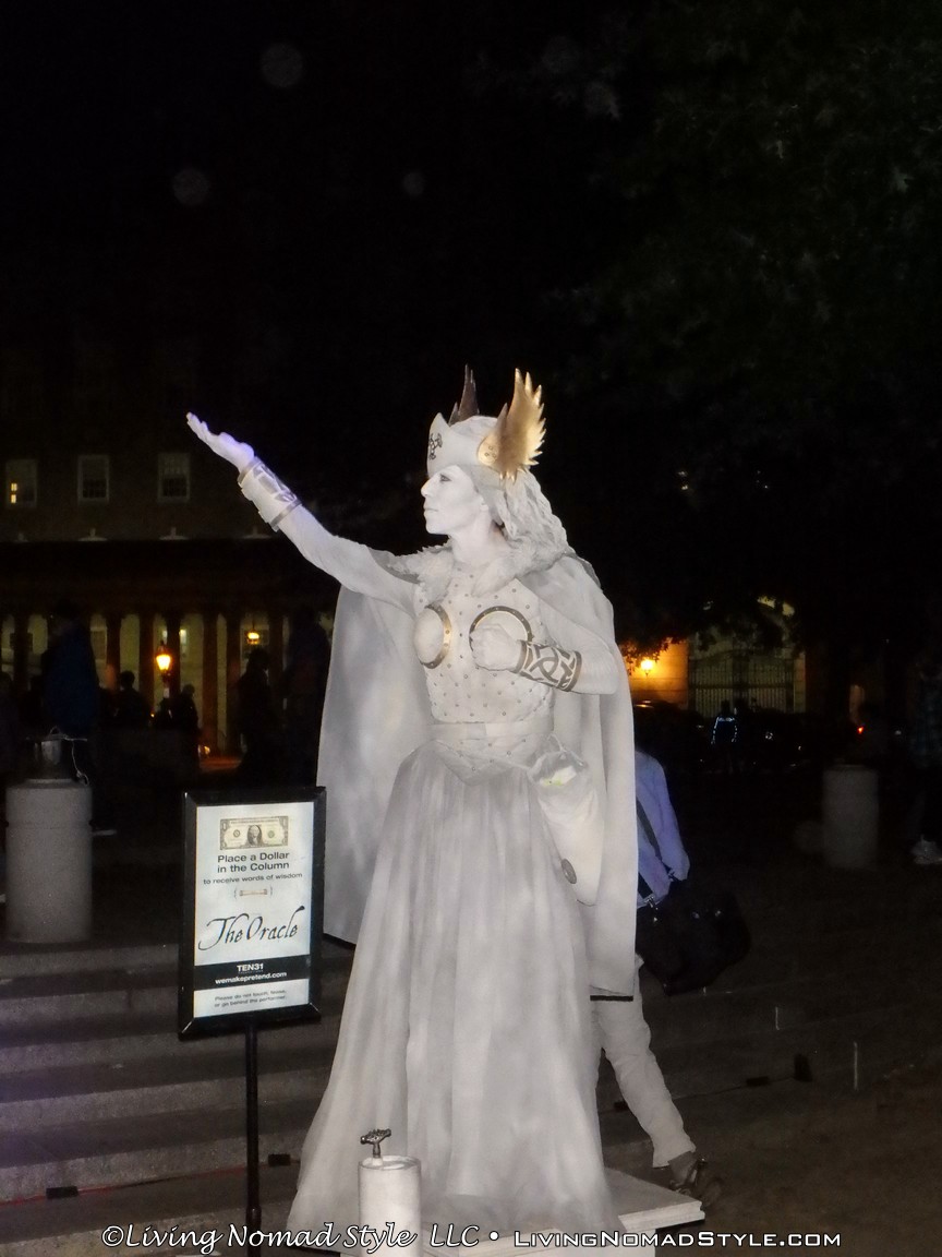 The park area in Market Square is somewhere you will want to explore at night. Around the base of the WWII memorial, you will find living statues of gargoyles and Norse figures. They accept tips and will move to their next pose upon tipping. When you explore a little further down, you will find a park filled with illuminated stars hanging from trees. This marks the end of the celebratory area.