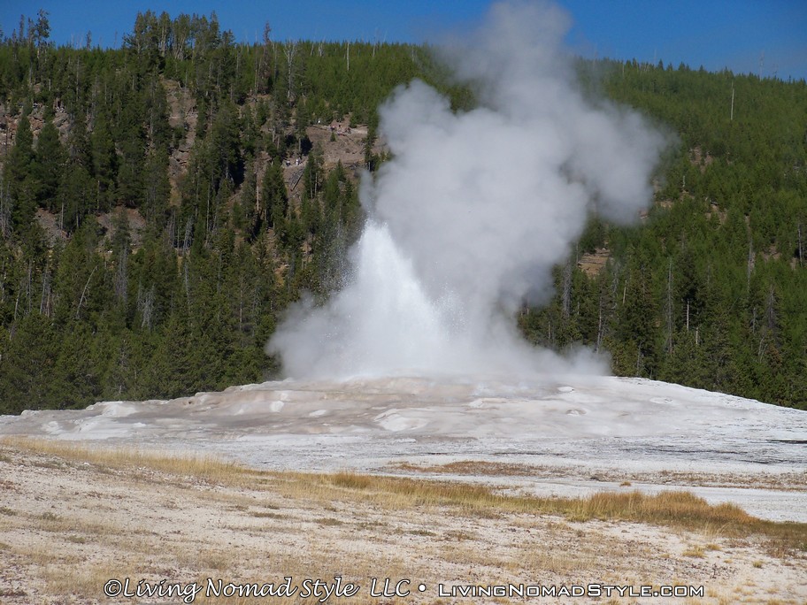 We left the Visitor Education Center and grabbed a spot on the benches in front of Old Faithful. It was sunny, comfortable temperature, minimum wind and a lot of people. It wasn’t too long before Old Faithful did what it does every hour to hour and a half. It erupted with a spectacular water show for us. This went on for many minutes as the water, steam and vapor would gush and shoot into the air. What a show.