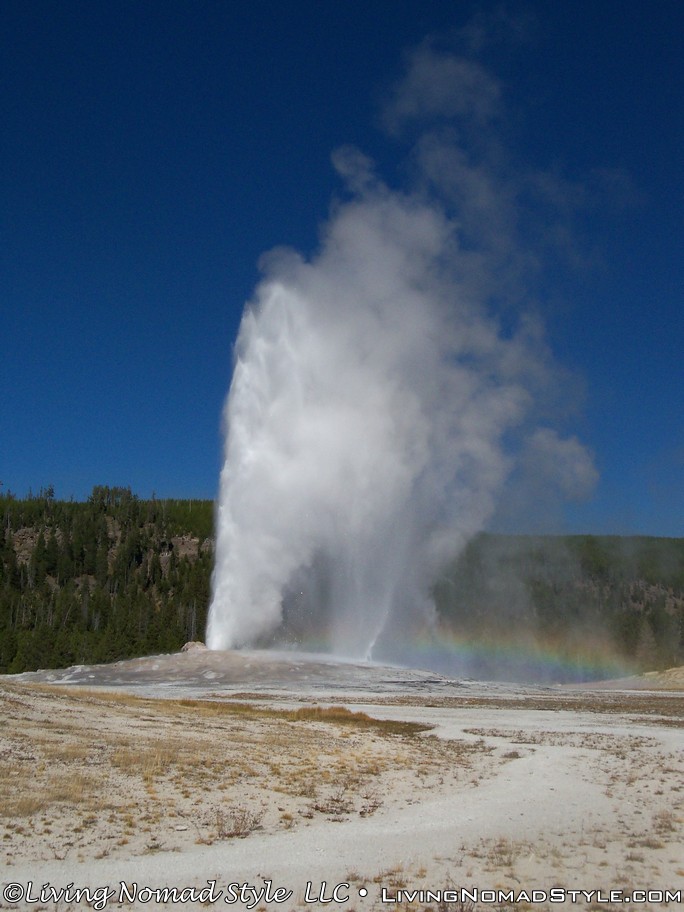 Old Faithful erupts about every 60 to 80 minutes, so we took a little time to learn about Old Faithful and the Geyser Basin in the Visitor Education Center. We learned all kinds of things that we were not aware of. Did you know Yellowstone had an active volcano? That is what produces the heat that causes all of the geysers to erupt. Did you know that the water erupting from Old Faithful is hotter than the surface boiling point? How about this. Did you know that hundreds to thousands of earthquakes happen at Yellowstone every year? Some you cannot feel and others you can. This is what allows the geysers to keep venting and not be sealed up by minerals. Really interesting stuff.