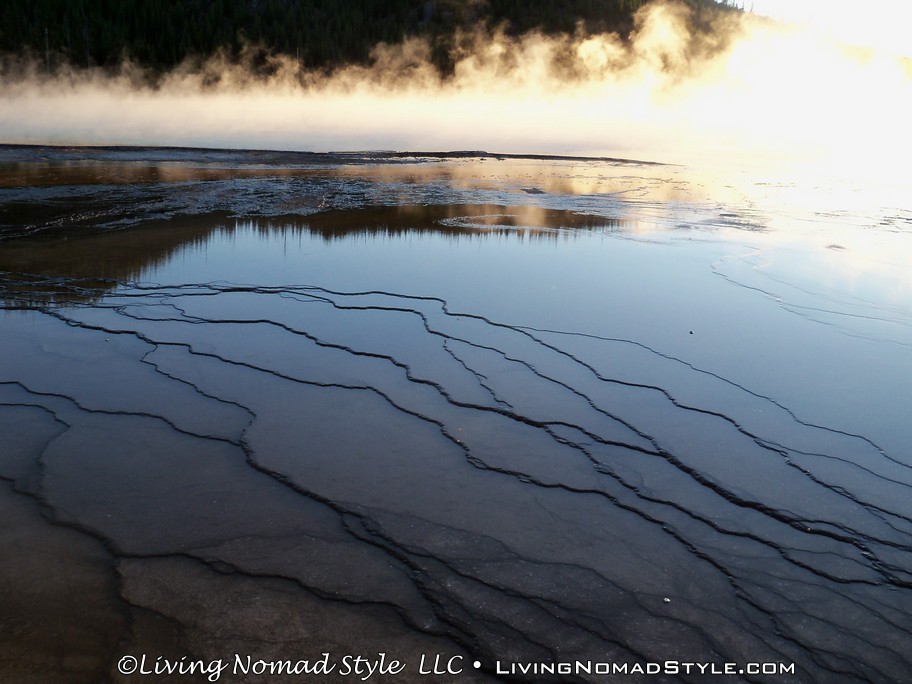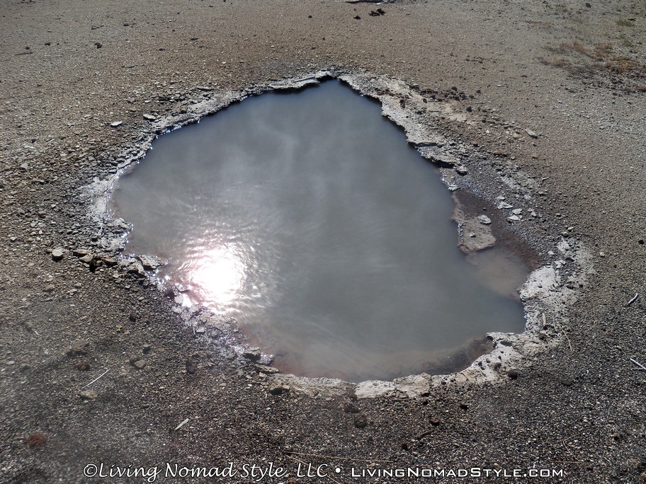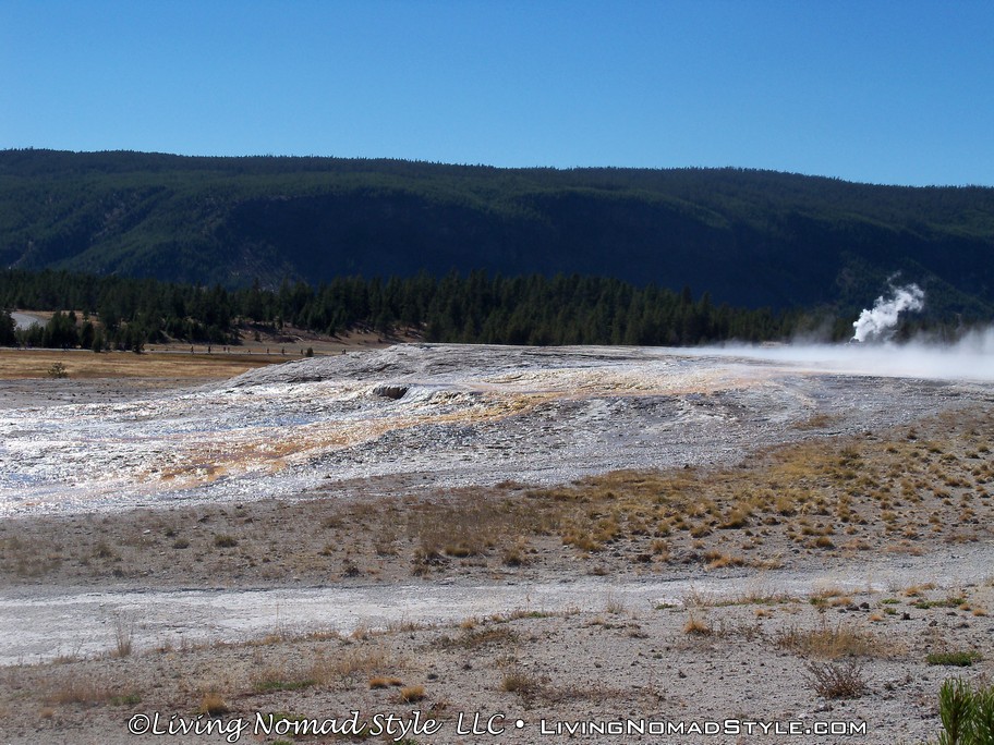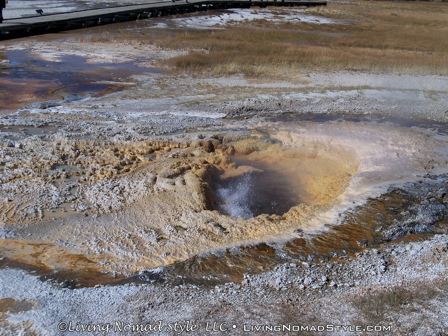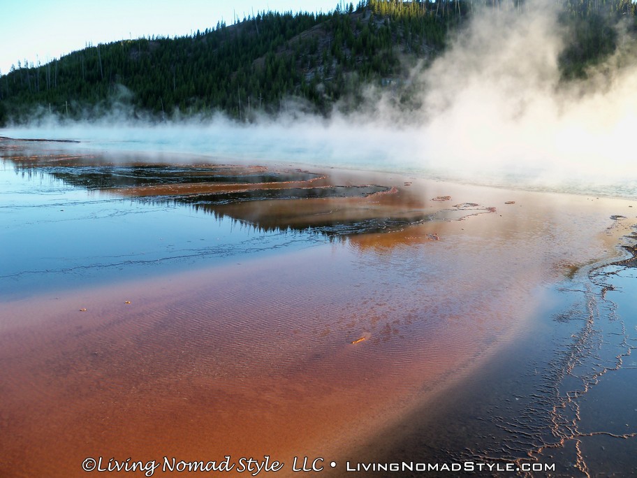 After spending about 3 hours or so in the Upper Geyser Basin, we hopped into Ebony and headed for the Midway Geyser Basin. We wanted to see one specific natural feature, The Grand Prismatic Spring. We had seen many pictures and they were all beautiful. Again, there is a path so stay on it. The path up to the Grand Prismatic Spring is about a 1/2 mile round trip. It will take you by Turquoise Pool, Opal Pool, Excelsior Geyser and lead you to the Grand Prismatic Spring, which is located at the top of the walkway.