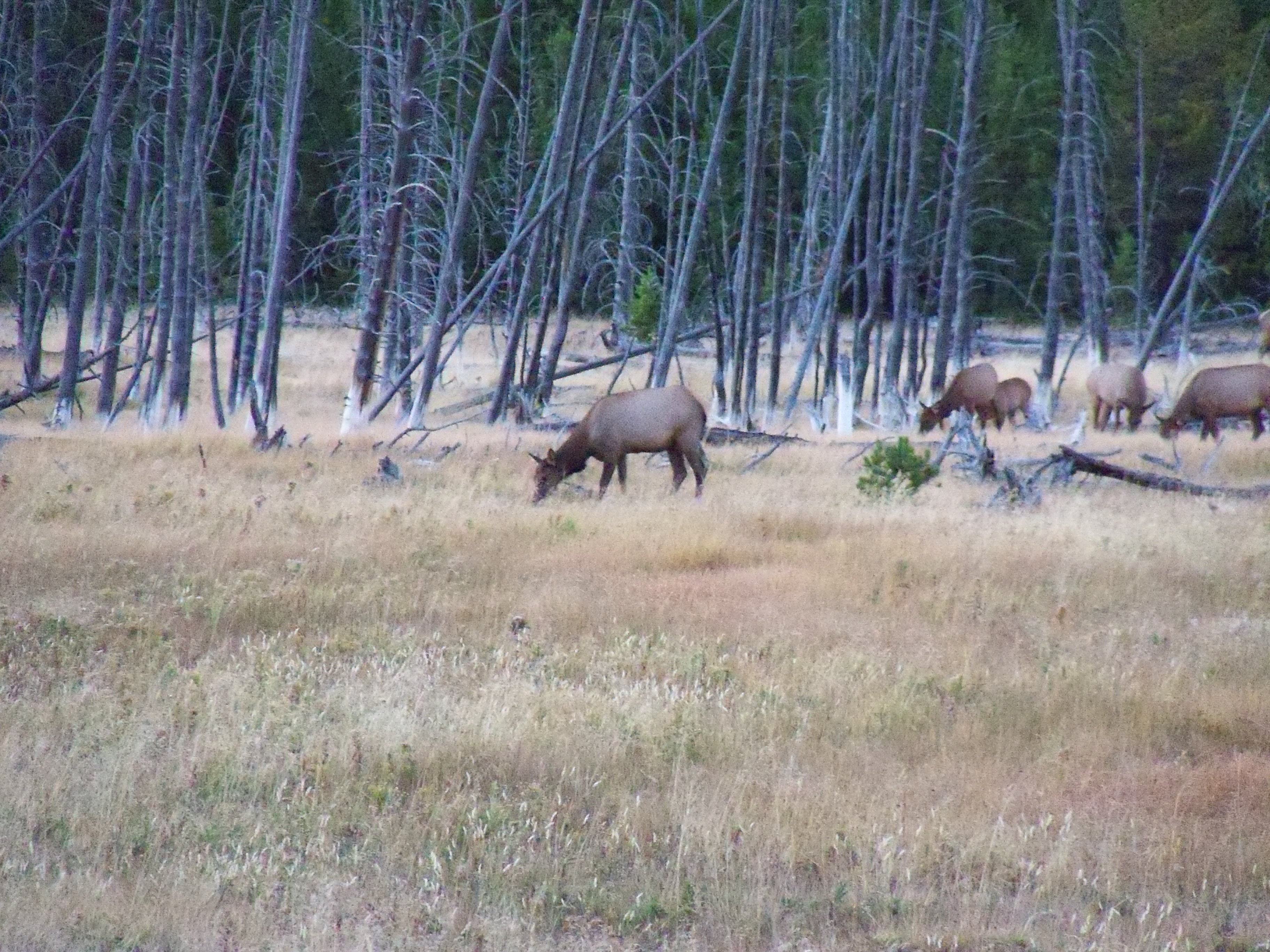 After the Midway Geyser Basin, we decided to head home as it was getting dark and we had a fairly long drive ahead of us. On the way out of the park, I decided to detour down a small road that seemed to go into the forest. I had been trying to find other wildlife beyond what we had seen already. About a half mile down the road, we struck gold. We happened upon an entire herd of elk. They were grazing in a field about 100 yards away. The detour was worth it.