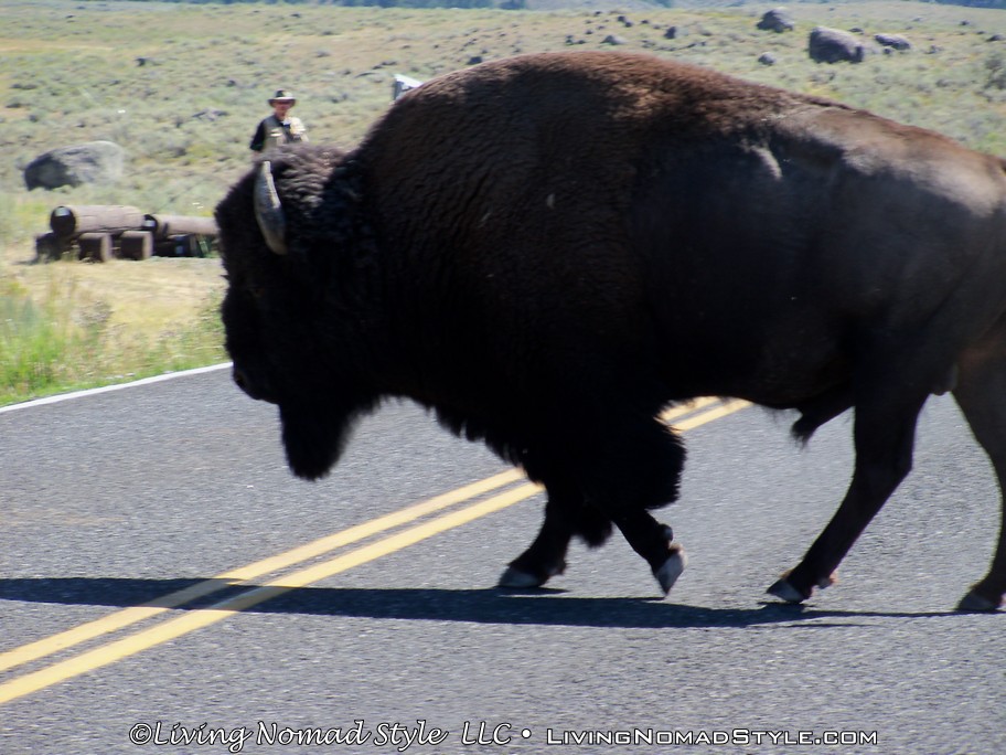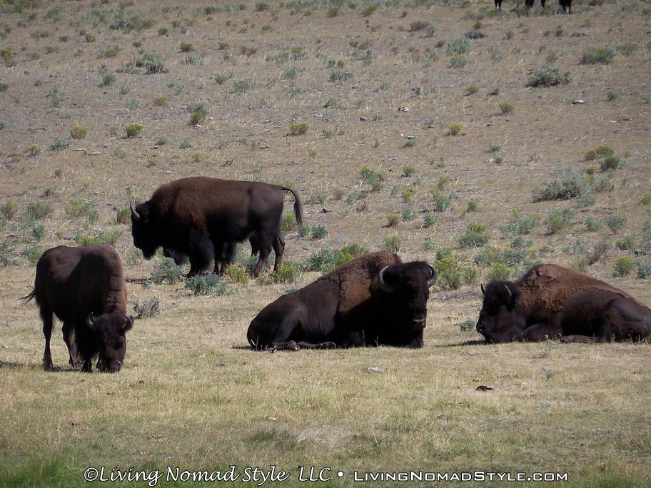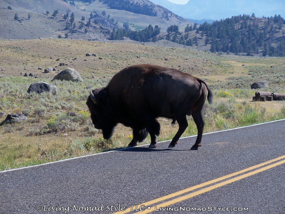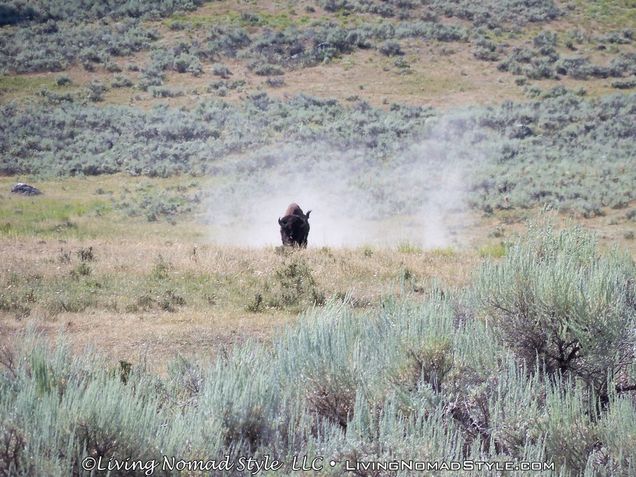 After leaving Tower Junction we saw lots and lots of scenery, but no animals. That was until I spotted one buffalo way off in the distance. So I pulled over and zoomed in to take its picture. I was afraid we would not see any more as our luck of spotting animals was not favorable. He meandered down the hill and stopped off to take a dust bath (he wallowed around in the dirt). It wasn’t too long before I realized that he was actually headed our way. I grabbed all of the Nomads and told them to get back in Ebony (including me). We sat in Ebony as this huge buffalo walked right in front of us about 10 feet from our bumper! Wow was that amazing!